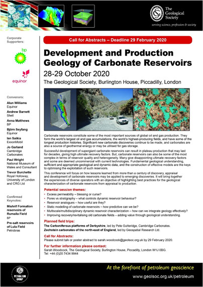 In October this year, Jo Garland will be co-convening a Geol Soc conference on the Development and Production Geology of Carbonate Reservoirs. Please submit talk or poster abstracts to sarah.woodcock@geolsoc.org.uk by 29 February 2020. There will be two associated field trips, one of which will be led by Pete Gutteridge:  The Carboniferous platforms of Derbyshire.