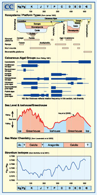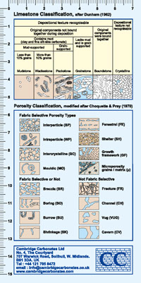 Please click on the thumbnails to download our Carbonate Card. This shows the Dunham textural classification of carbonates, the Choquette and Pray carbonate pore classification, and how ecosystems, sea level, climate, sea water chemistry and the Strontium isotope composition of marine carbonates have changed through the Phanerozoic.